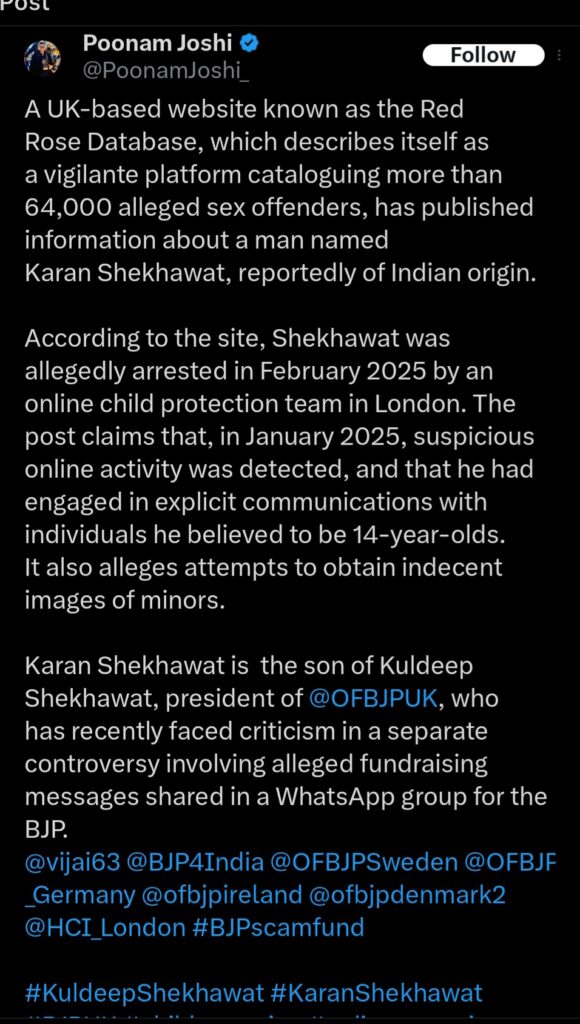 New Delhi: Karan Shekhawat, 34, son of Kuldeep Shekhawat, President of the Overseas Friends of BJP UK (OFBJP), was arrested by London’s Metropolitan Police in February 2025 on charges linked to online child grooming and sexual communication with minors, according to reports from Fleetwood Enforcers UK and MaDebyRedRose. The case has sent ripples through the UK’s Indian diaspora and sparked scrutiny over the Shekhawat family’s activities associated with OFBJP.