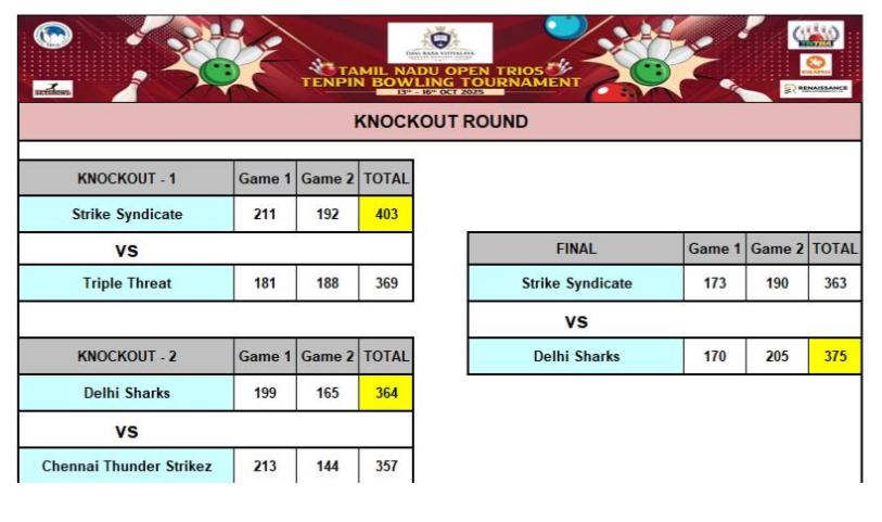 In an exciting final, played on Baker format based on cumulative pinfall of 2 games, the Delhi Sharks — comprising Dhruv Sarda, Palguna Reddy, and Sunil Sharma — defeated Strike Syndicate Chennai (Soban D, Ganesh N.T., and Gurunathan) by a narrow margin of 12 pins (375–363).