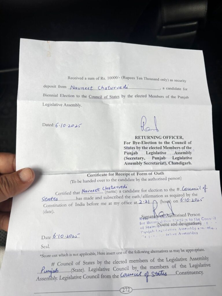 Chandigarh: Punjab’s political dynamics were shaken on Monday as Janata Party President Navneet Chaturvedi officially filed his nomination for the upcoming Rajya Sabha elections as an independent candidate, securing unexpected support from ten MLAs of the ruling AAP.